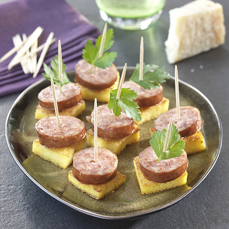 Posez 1 tranche de Montbéliard sur chaque carré de polenta et faites tenir avec un cure-dent. Décorez de quelques feuilles de persil.
