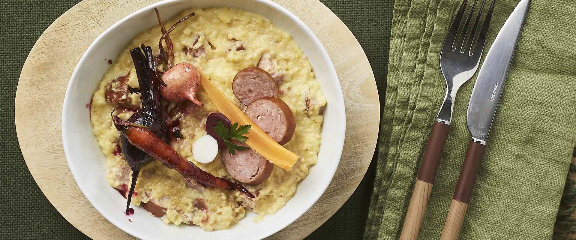 Légumes glacés au cassis de Bourgogne, polenta crémeuse et Saucisse de Montbéliard