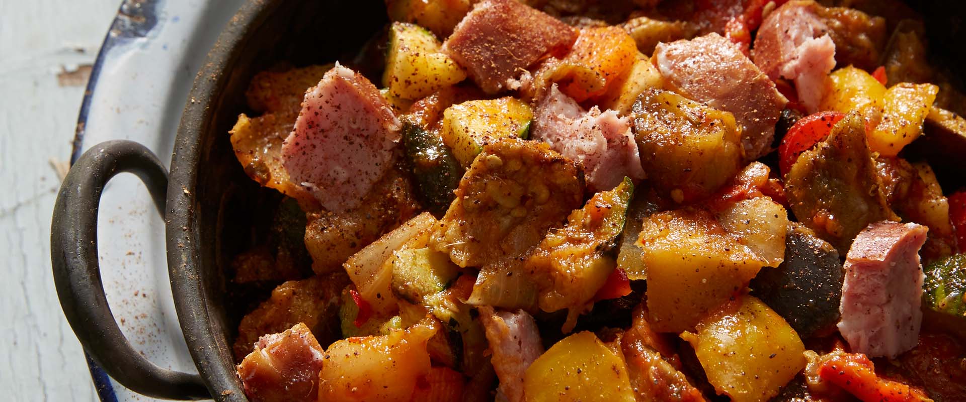 Faites chauffer l’huile d’olive, faites suer l’oignon et l’ail. Ajoutez les lamelles de poivrons, les dés de courgettes puis d’aubergines ainsi que les dés de saucisses, remuez.