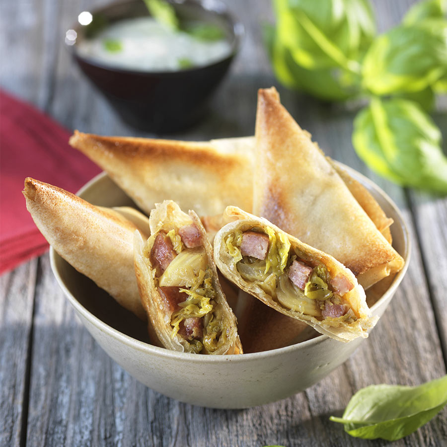 Déposez 1 cuillère à soupe de chou à la saucisse en bas au centre de la pâte et repliez celle-ci sur la farce, de droite à gauche, en haut, puis de gauche à droite et ainsi de suite jusqu’à obtenir un triangle. Répétez l’opération avec toutes les feuilles de brique.