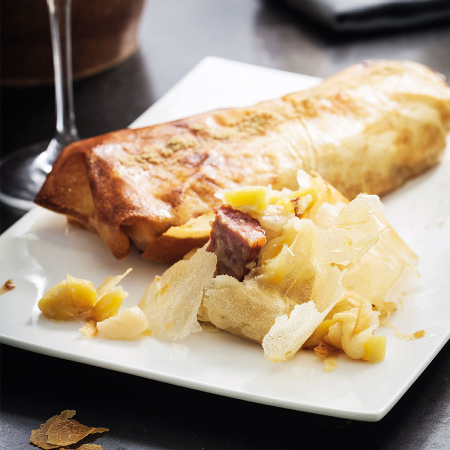 Étalez la compotée et parsemez de cubes de Comté fruité dans toute la longueur de vos feuilles de brick.
