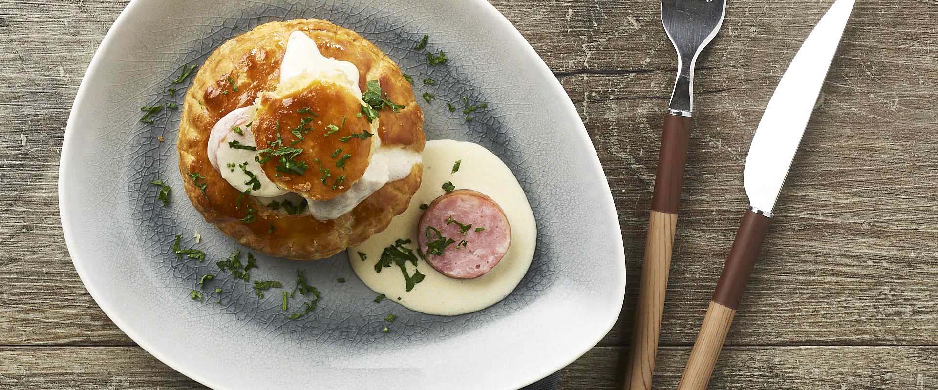 Vol-au-vent, quenelle de veau, crème de Soumaintrain et Saucisse de Montbéliard